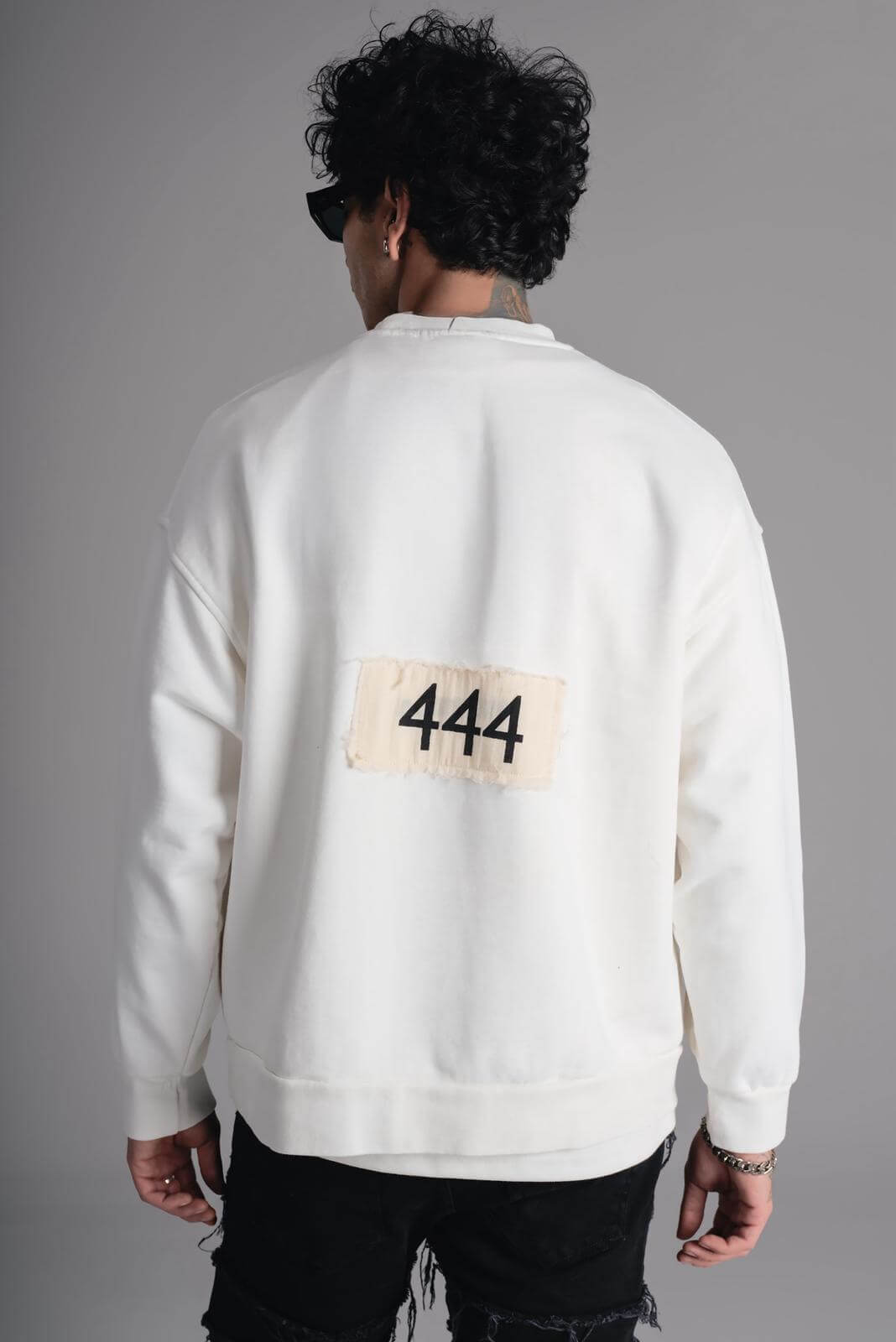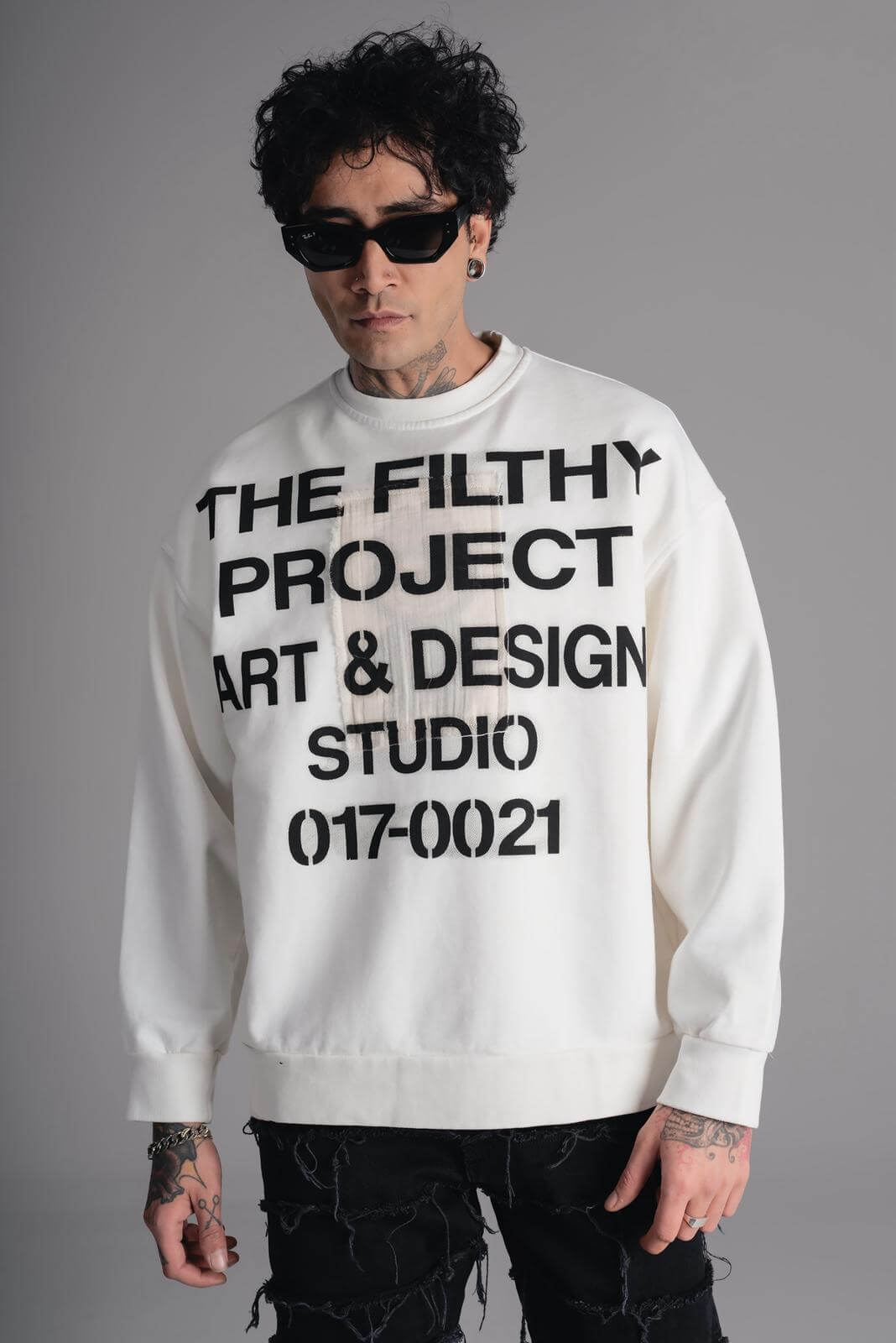 Biała bluza męska o luźnym, nowoczesnym kroju, inspirowana estetyką streetwear i artystycznym designem.
