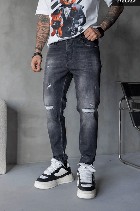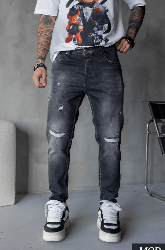 Spodnie jeansowe męskie wykonane z elastycznego denimu, który zapewnia komfort noszenia i swobodę ruchów. Model wyróżnia się imitacją dziur na nogawkach, pod którymi zastosowano materiałowe łaty, dzięki czemu spodnie zachowują spójny wygląd i trwałość.