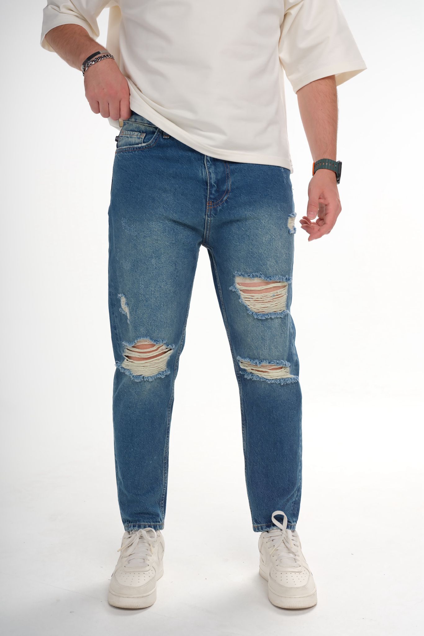Postaw na miejski, swobodny styl z męskimi jeansami z modnymi przetarciami. Model w klasycznym, niebieskim odcieniu sprawdzi się na co dzień – świetnie wygląda z T-shirtem, bluzą lub bomberką. Przetarcia nadają im charakteru, a elastyczny materiał zapewnia wygodę noszenia przez cały dzień. Idealny wybór dla mężczyzn, którzy lubią łączyć casualowy look z nutą streetwearu.